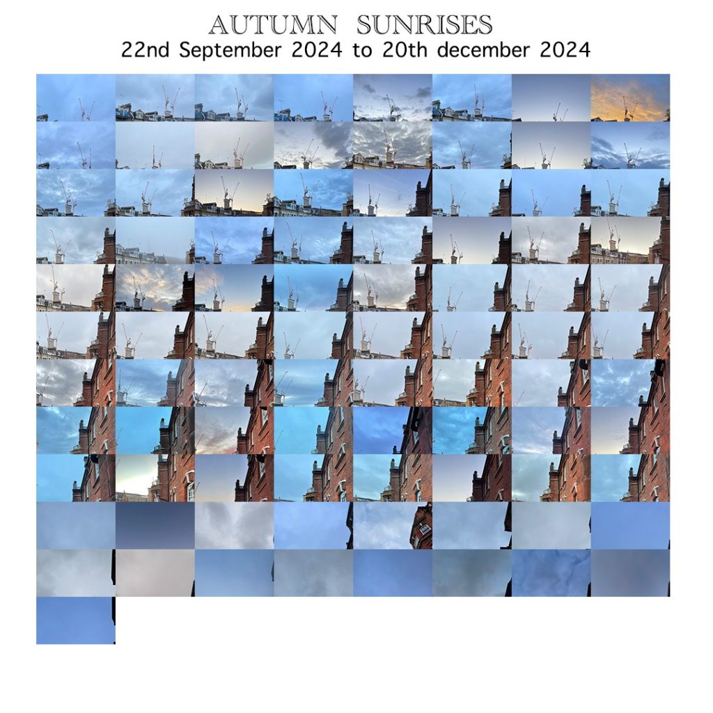 archive process-based unravelling | process-based sugar | photography India hijra | photography India laundry | photography India paper-making | photography Calais |photography commission | installation drawings | Brompton Cemetery | sunrise | from Tussaud summer sunrises | photography - unedited digital photographs on paper, mounted on foamboard | 38 x 38 cm (unframed) | £250 | available autumn sunrises | photography - unedited digital photographs on paper, mounted on foamboard | 38 x 38 cm (unframed) | £250 | available winter sunrises | photography - unedited digital photographs on paper, mounted on foamboard | 38 x 38 cm (unframed) | £250 | available